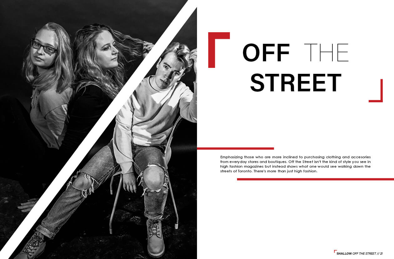 When one thinks of a fashion magazine, the more high-end and glamourous style of fashion tends to come to mind first. For that reason I wanted to design a magazine that gives off a more everyday wear feel. Through photo editing I was able to give off a less glamourous and air-brushed feel and give off a more natural look.